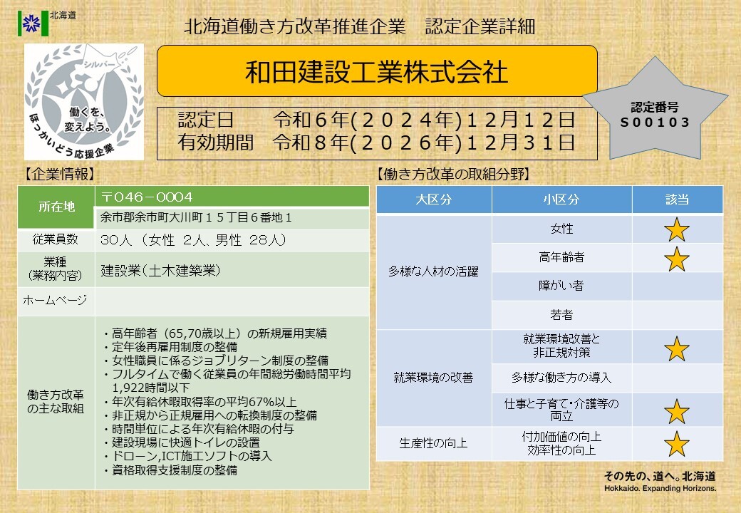 S00103 | 和田建設工業株式会社 | 余市郡余市町 | 詳細 |