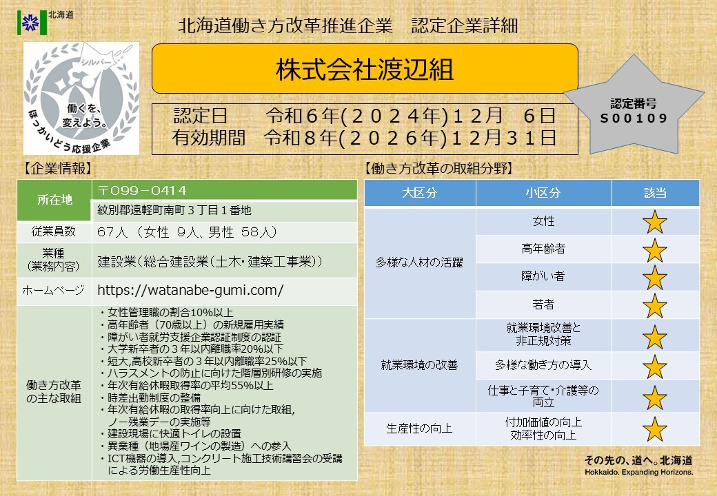 S00109 | 株式会社渡辺組 | 紋別郡遠軽町 | 詳細 |